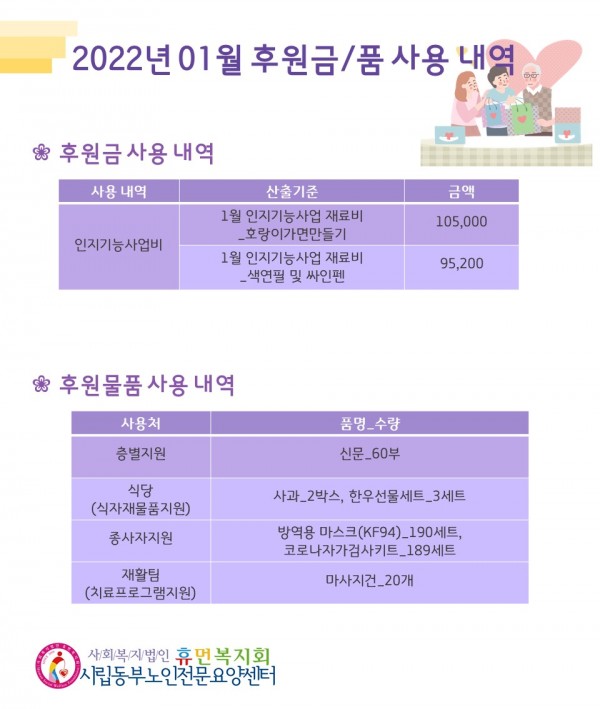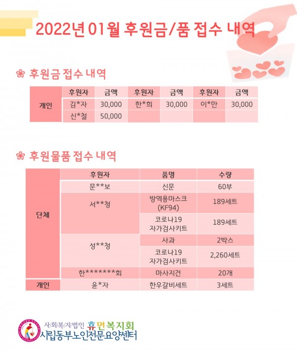 2022년 1월 후원금/품 접수내역, 사용내역 페이지 정보 작성자 최고관리자 작성일2022-02-10 18:53 조회11,993회 댓글0건 관련링크 이전글 다음글 목록 본문 1월에도 우리 센터에 관심과 사랑을 베풀어주셔서 감사합니다.추워지는 계절에 감기 조심하시고, 새해 복 많이 받으시기 바랍니다.2022년 2월에도 많은 사랑과 관심 부탁드립니다. 댓글목록 등록된 댓글이 없습니다. 이전글 다음글 목록