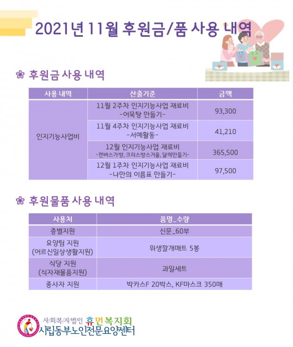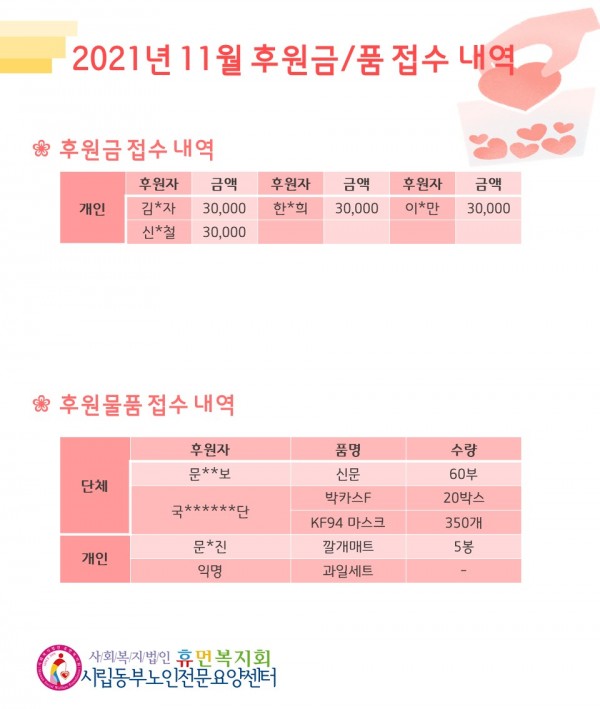 2021년 11월 후원금/품 접수내역, 사용내역 페이지 정보 작성자 최고관리자 작성일2021-12-07 10:48 조회12,255회 댓글0건 관련링크 이전글 다음글 목록 본문 11월에도 우리 센터에 관심과 사랑을 베풀어주셔서 감사합니다.성큼 다가온 겨울 추위에 감기와 코로나 조심하시고, 12월에도 많은 사랑 부탁드립니다. 댓글목록 등록된 댓글이 없습니다. 이전글 다음글 목록