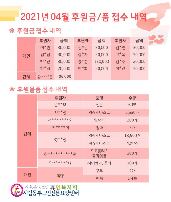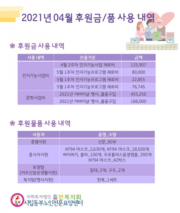 2021년 4월 후원금/품 접수내역, 사용내역 페이지 정보 작성자 최고관리자 작성일2021-05-07 18:23 조회12,568회 댓글0건 관련링크 이전글 다음글 목록 본문 4월 시립동부노인전문요양센터에 후원해주신 모든 분들께 많은 감사의 인사를 전해드립니다.일교차로 인해 모두 감기 조심하시고, 5월에도 많은 관심과 사랑 부탁드립니다:) 댓글목록 등록된 댓글이 없습니다. 이전글 다음글 목록