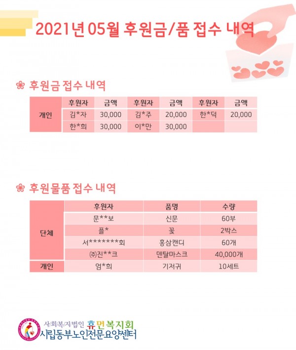2021년 5월 후원금/품 접수내역, 사용내역 페이지 정보 작성자 최고관리자 작성일2021-06-04 09:25 조회12,707회 댓글0건 관련링크 이전글 다음글 목록 본문 여름이 찾아 오는 5월에도 많은 관심과 사랑의 손길을 베풀어 주셔서 감사합니다.6월에도 많은 관심과 사랑을 부탁 드립니다. :) 댓글목록 등록된 댓글이 없습니다. 이전글 다음글 목록