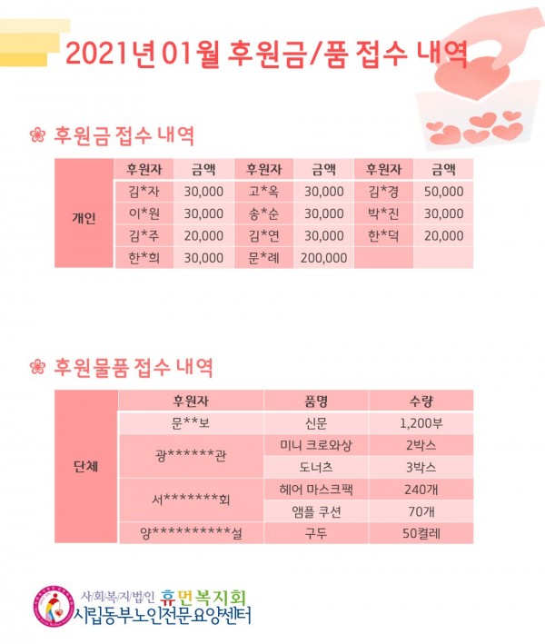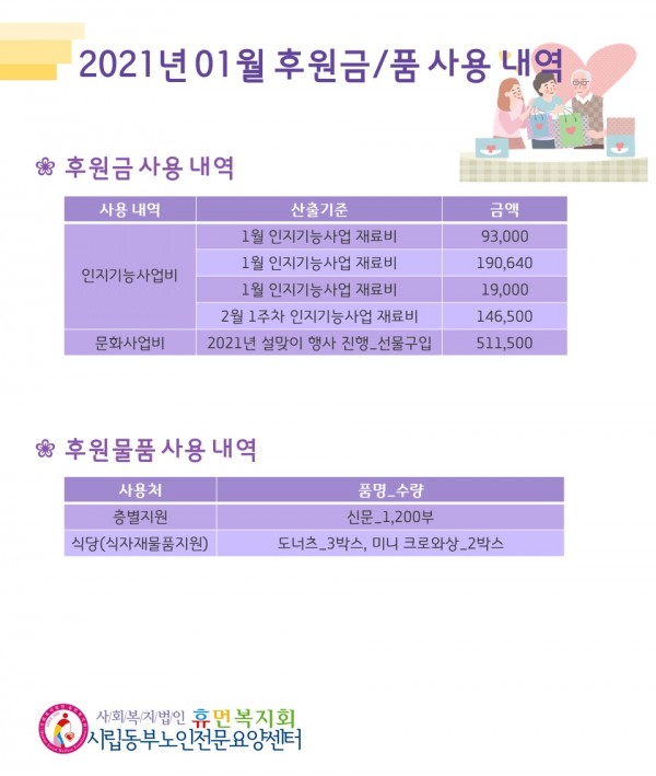 2021년 1월 후원금/품 접수내역, 사용내역 페이지 정보 작성자 최고관리자 작성일2021-02-04 08:14 조회12,716회 댓글0건 관련링크 이전글 다음글 목록 본문 2021년 신축년의 해가 밝았습니다! 2021년에는 모두 건강하시고, 하는 일 잘 될 수 있도록 기도드리겠습니다:-)2월에도 많은 관심과 후원 부탁드립니다. 댓글목록 등록된 댓글이 없습니다. 이전글 다음글 목록