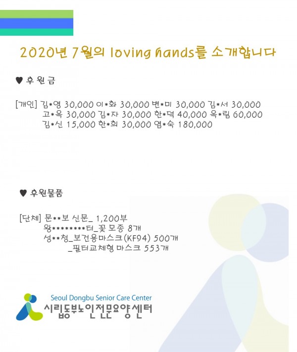 2020년 7월 loving hands!!를 소개합니다. 페이지 정보 작성자 최고관리자 작성일2020-08-05 09:12 조회13,249회 댓글0건 관련링크 이전글 다음글 목록 본문 본격적인 여름과 더불어 장마기간 많은 양의 비로 인해 힘든 하루하루 보내고 계시지만 늘 우리 동부를 위해 많은 관심과 사랑을 주시는 여러분들께 감사의 말씀 전해드립니다.8월에도 동부에 많은 사랑 부탁드립니다. 감사합니다♥ 댓글목록 등록된 댓글이 없습니다. 이전글 다음글 목록