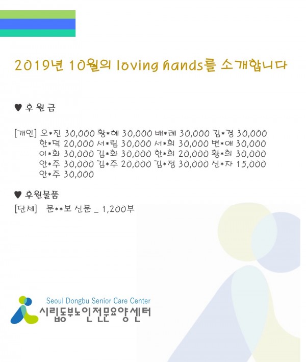 2019년 10월 loving hands!!를 소개합니다. 페이지 정보 작성자 최고관리자 작성일2019-11-04 16:32 조회13,895회 댓글0건 관련링크 이전글 다음글 목록 본문 겨울이 성큼 다가왔습니다. 모두 감기 조심하시고, 10월에도 많은 관심과 사랑의 손길을 베풀어 주셔서 감사합니다.11월에도 많은 관심과 사랑을 부탁 드립니다. 댓글목록 등록된 댓글이 없습니다. 이전글 다음글 목록