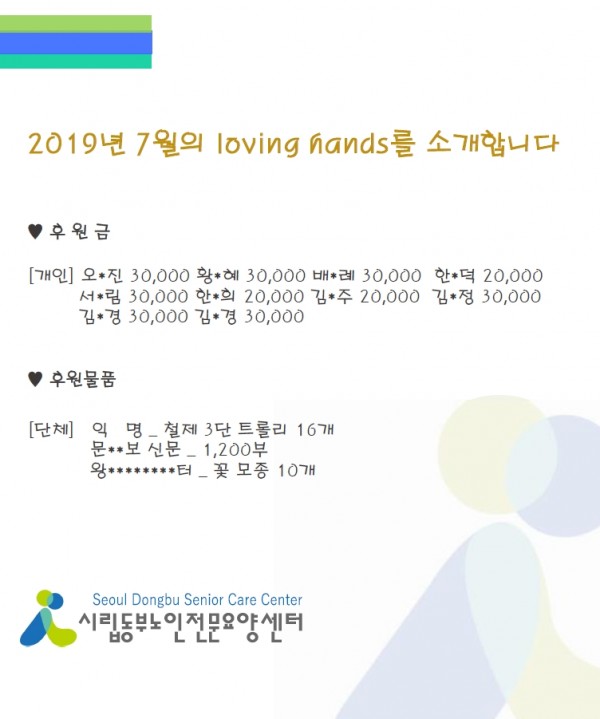 2019년 7월 loving hands!!를 소개합니다. 페이지 정보 작성자 최고관리자 작성일2019-08-06 18:22 조회14,149회 댓글0건 관련링크 이전글 다음글 목록 본문 무더위와 장마가 찾아오는 7월 , 사랑의 손길을 내밀어주신 후원자님께 다시한번 감사의 말씀을 드립니다.8월에도 동부에게 많은 관심과 사랑 부탁 드립니다. 댓글목록 등록된 댓글이 없습니다. 이전글 다음글 목록