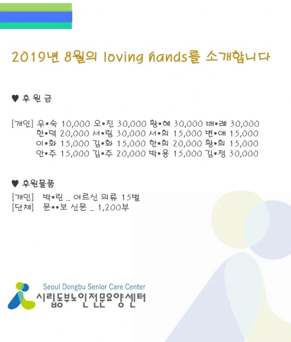 2019년 8월 loving hands!!를 소개합니다. 페이지 정보 작성자 최고관리자 작성일2019-09-05 16:43 조회14,019회 댓글0건 관련링크 이전글 다음글 목록 본문 뜨거운 여름, 8월에도 많은 관심과 사랑을 주셔서 감사합니다.이제는 제법 시원한 9월이 찾아 왔습니다. 9월에도 많은 관심과 사랑의 손길을 베풀어주세요!^^ 감사합니다. 댓글목록 등록된 댓글이 없습니다. 이전글 다음글 목록