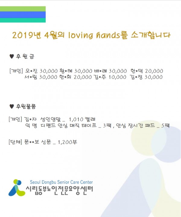 2019년 4월 loving hands!!를 소개합니다. 페이지 정보 작성자 최고관리자 작성일2019-05-07 17:53 조회14,514회 댓글0건 관련링크 이전글 다음글 목록 본문 따스한 봄이 찾아오는 4월에도 많은 관심과 사랑의 손길을 베풀어 주셔서 감사합니다.5월에도 많은 관심과 사랑을 부탁 드립니다. 댓글목록 등록된 댓글이 없습니다. 이전글 다음글 목록