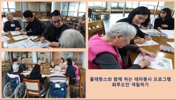 [복지]똘레랑스와 함께하는 재미있는 테마 봉사 페이지 정보 작성자 송유라 작성일2019-03-27 18:10 조회3,265회 댓글0건 관련링크 이전글 다음글 목록 본문 안녕하세요^^3월 23일에 진행된 똘레랑스(자원봉사자 단체) 멤버분들이 동부를 방문해주셨습니다^ㅡ^동부어르신들과 재미나는 화투 도안 색칠하기를 진행하였습니다!!다양한 테마봉사활동을 통하여 입소어르신들의 재미,활력을 느끼시길 바랍니다^^ 감사합니다! 댓글목록 등록된 댓글이 없습니다. 이전글 다음글 목록